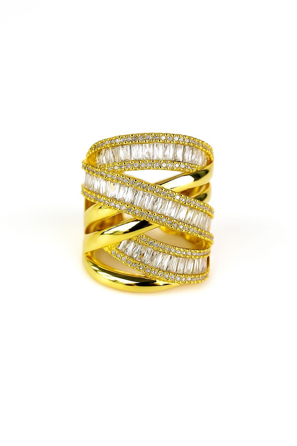 Anillo dorado con zirconias y cristal que brilla con audacia. Mide 2.5 cm de largo con baño de oro de 18 k que garantiza durabilidad y ese brillo cautivador que no pasa desapercibido. Talla 8. Perfecto para quien se atreve a llevar accesorios que hablen por sí solos, combinando elegancia con un toque de rebeldía.