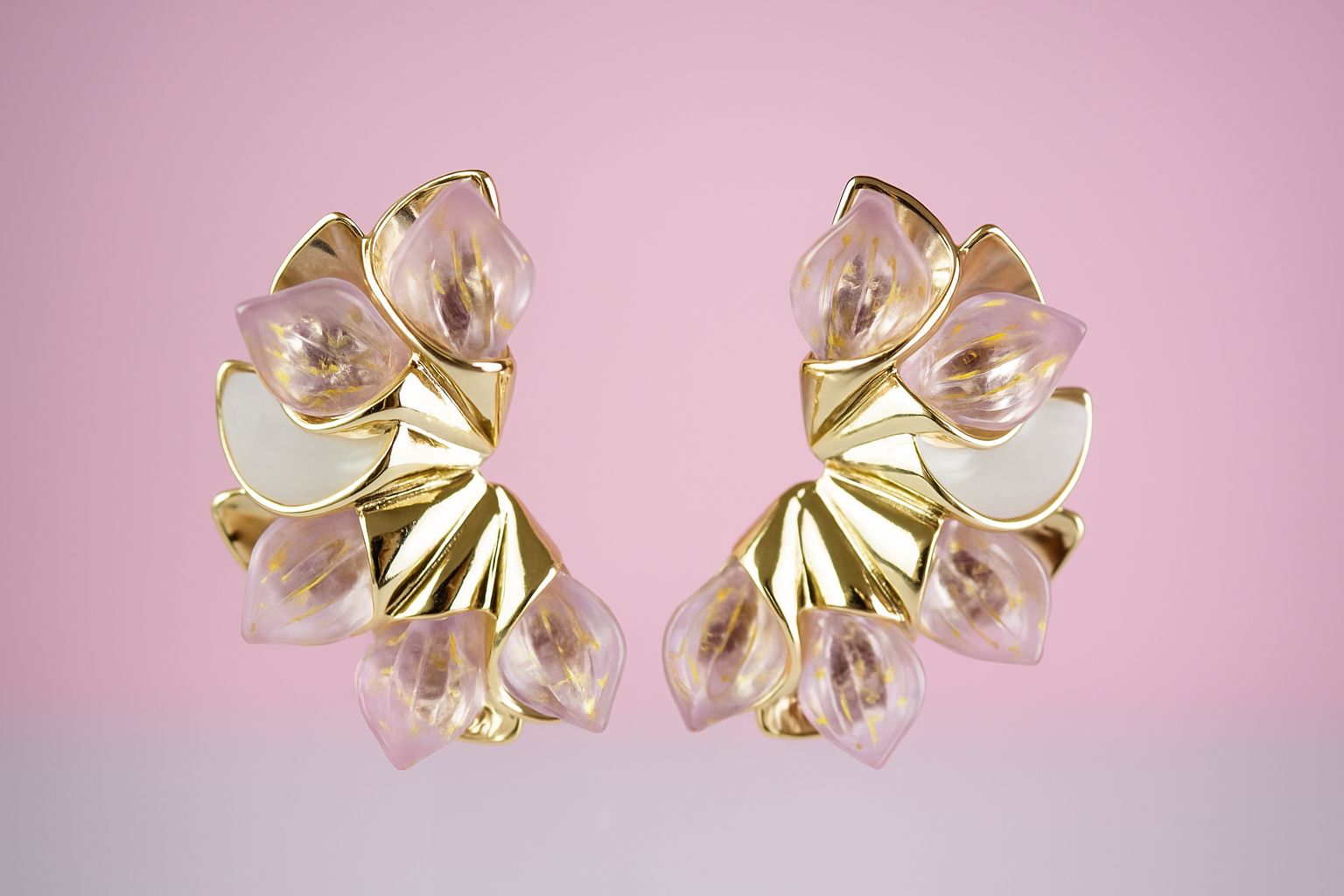 Aretes Media Flor Grandes que se atreven a romper la monotonía. Flores en acrílico rosa vibrante fusionadas con oro de 18k en una combinación audaz que grita sofisticación. A 4.4 cm de largo, estos aretes no pasan desapercibidos: son la pieza que transforma tu look de ordinario a extraordinario. Para quien no teme brillar y sabe que el verdadero lujo está en los detalles. Úsalos y demuestra que tienes estilo propio.