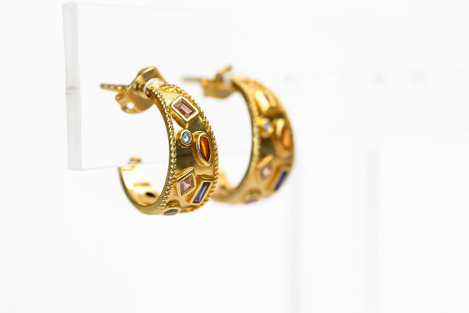 Arracadas mini que brillan con audacia. Diseñadas en baño de oro de 18k, estas piezas delicadas lucen piedras de colores vibrantes que capturan la luz con cada movimiento. Con apenas 1.6 cm de largo, son perfectas para quienes buscan un toque dorado sin renunciar al impacto visual. Versátiles y atrevidas, complementan cualquier look con elegancia minimalista.