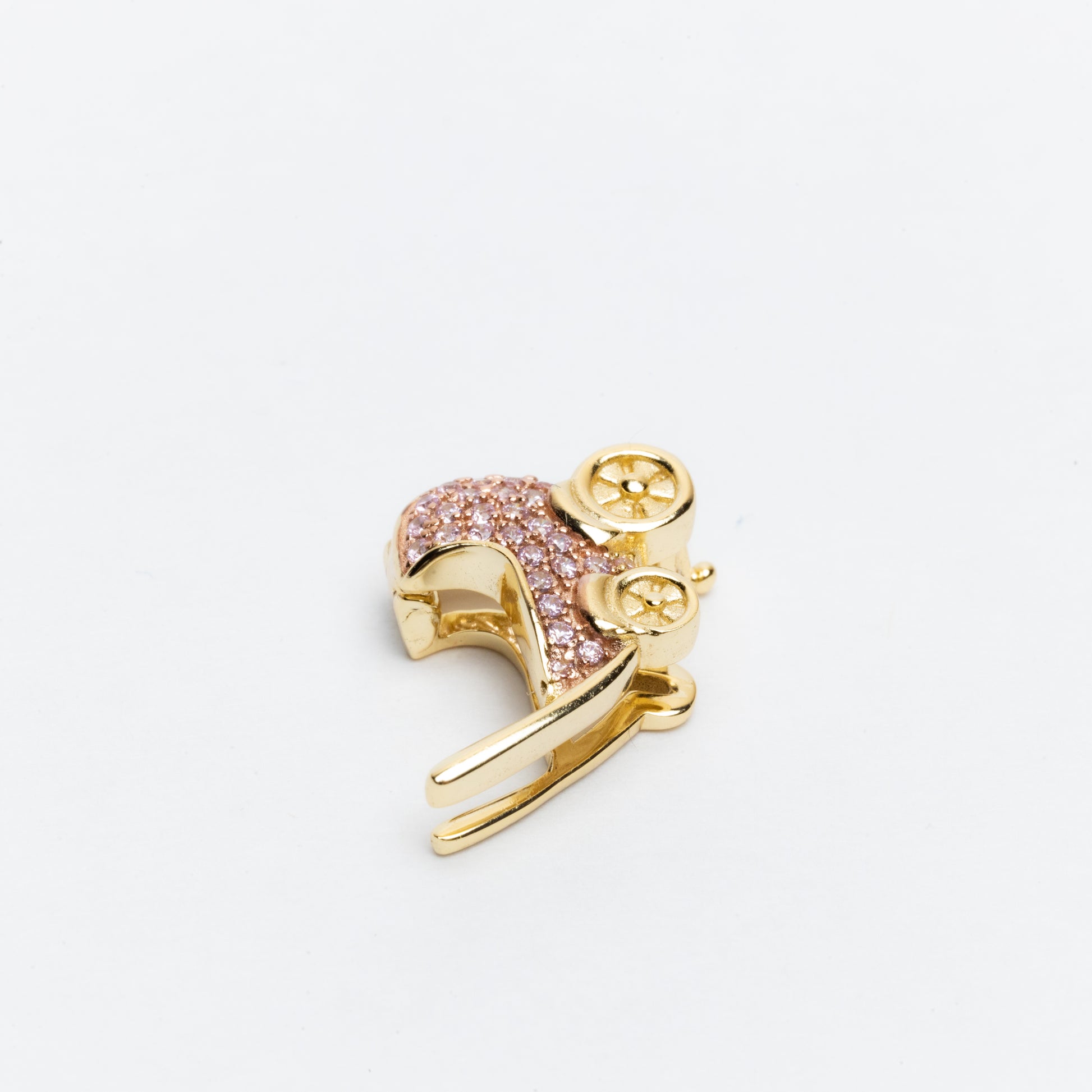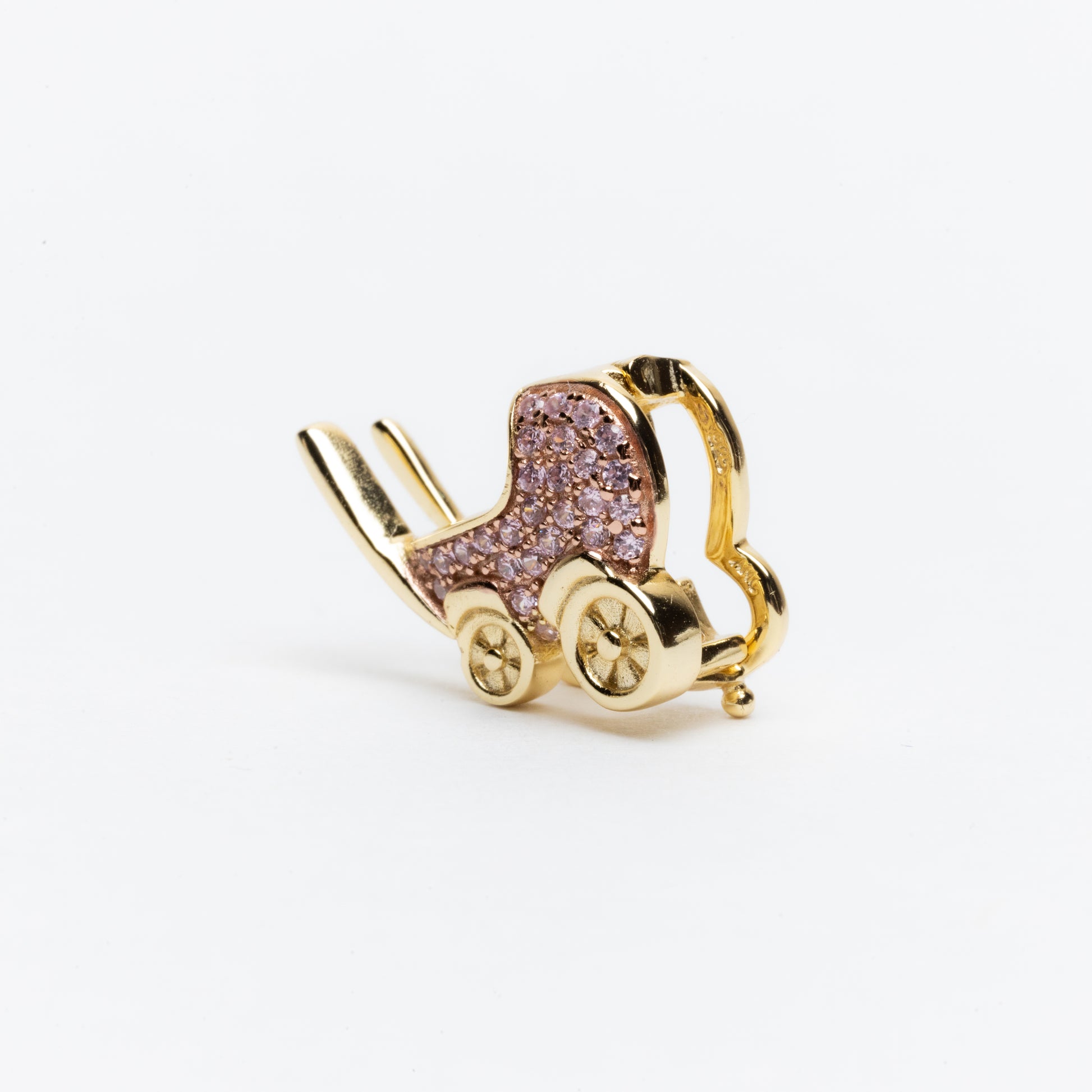 El dije de carriola es perfecto para celebrar momentos especiales y simboliza la llegada de un nuevo miembro a la familia. Su acabado brillante y detallado lo convierte en una pieza única que captará todas las miradas.